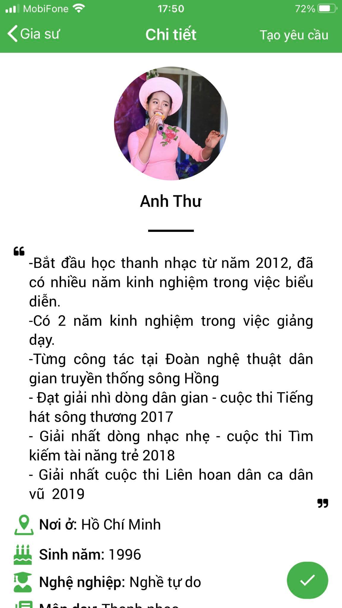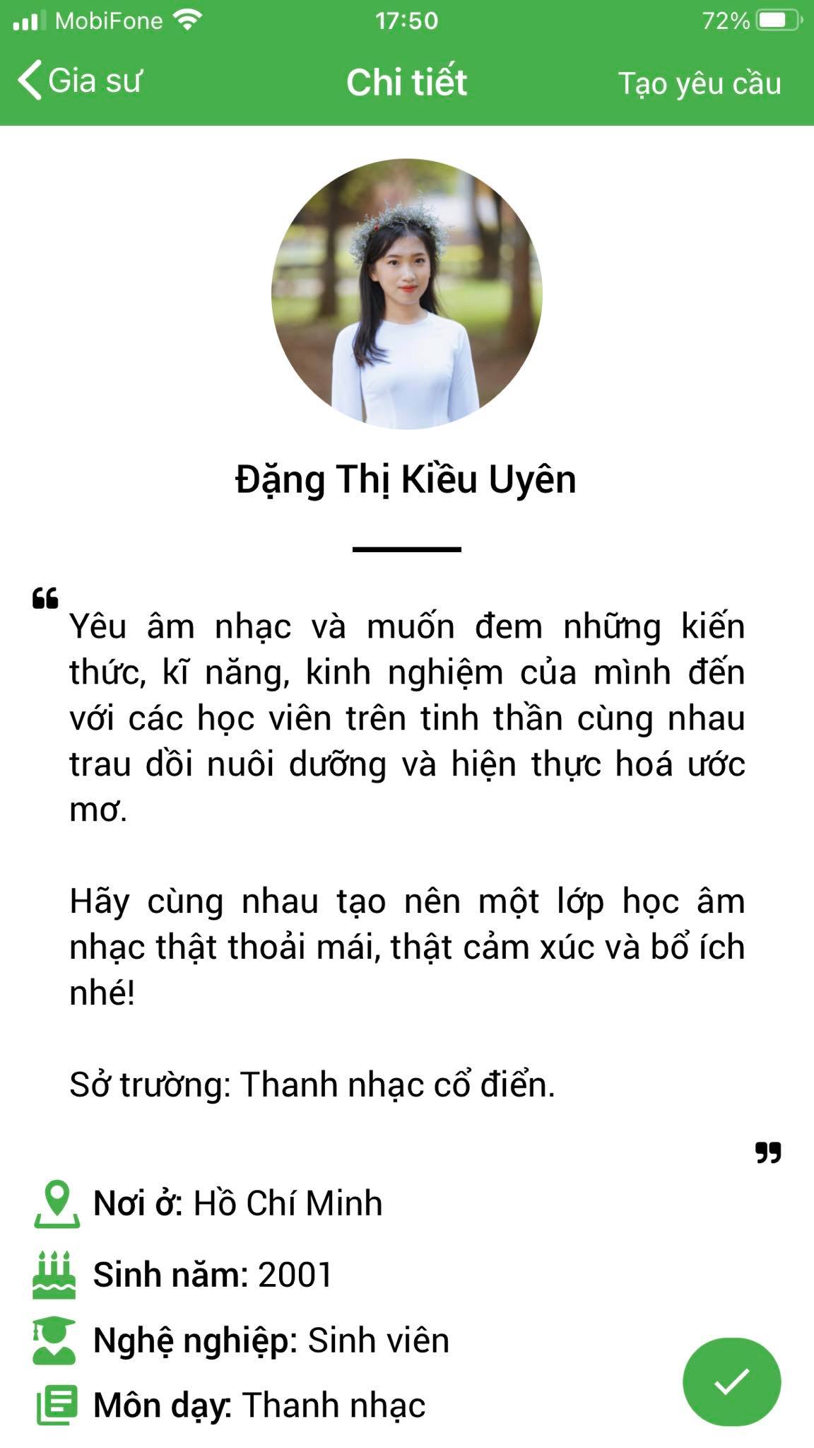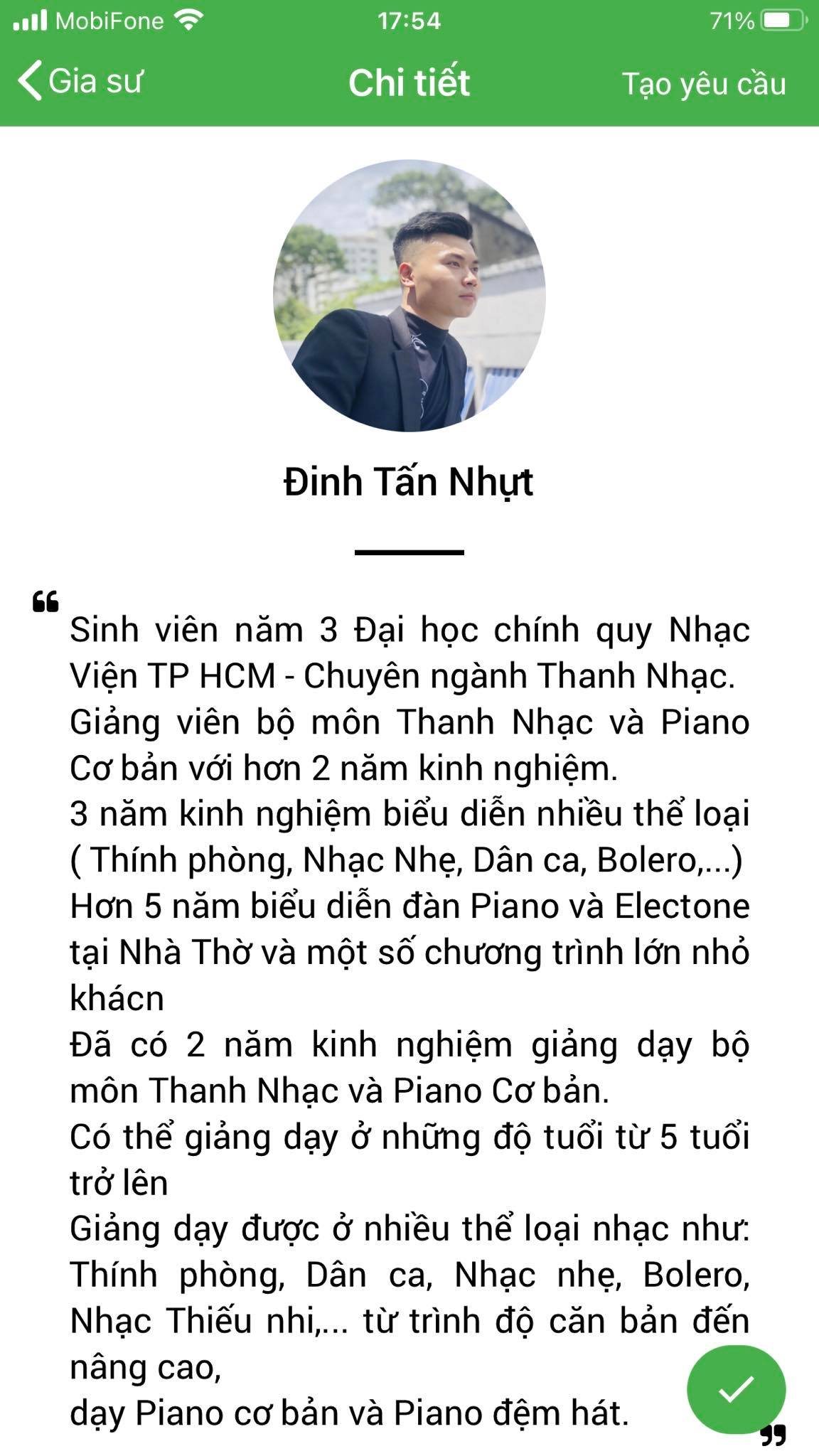 Mình là Nhàn gvien dạy guitar, mình thường xuyên nhận lớp tại ứng dụng daykemtainha.vn, do mình dạy nhiều nên không có thời gian qua trung tâm, mình chỉ qua 2 lần tại quận 8 phạm thế hiển còn những lần sau đa số mình nhận lớp qua chuyển khoản, nhận lớp tiện lợi, lớp có trục trặc từ phụ huynh mình đều được chị My chuyển khoản lại. mình nhận lớp ở đây rất an tâm.