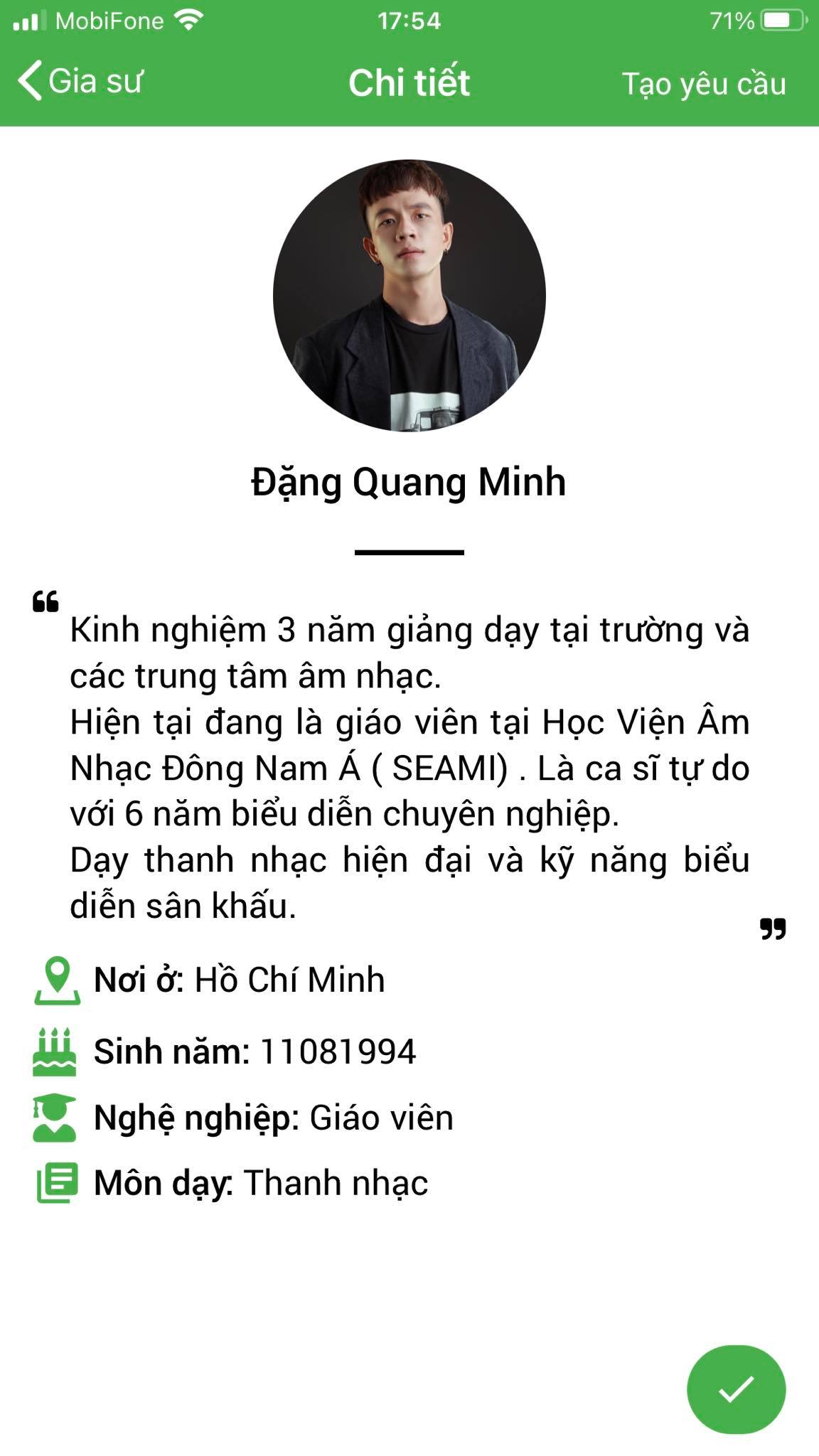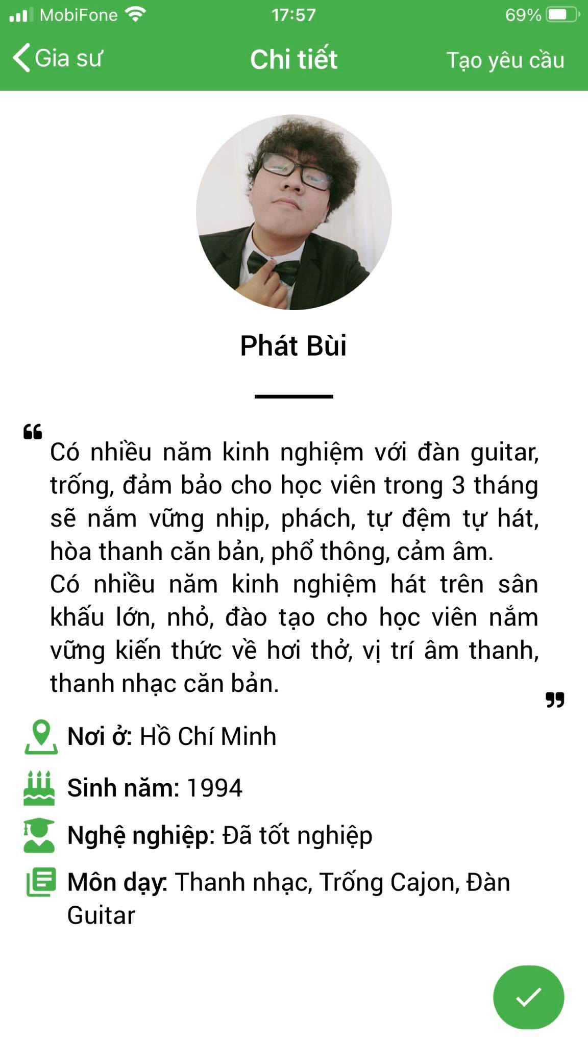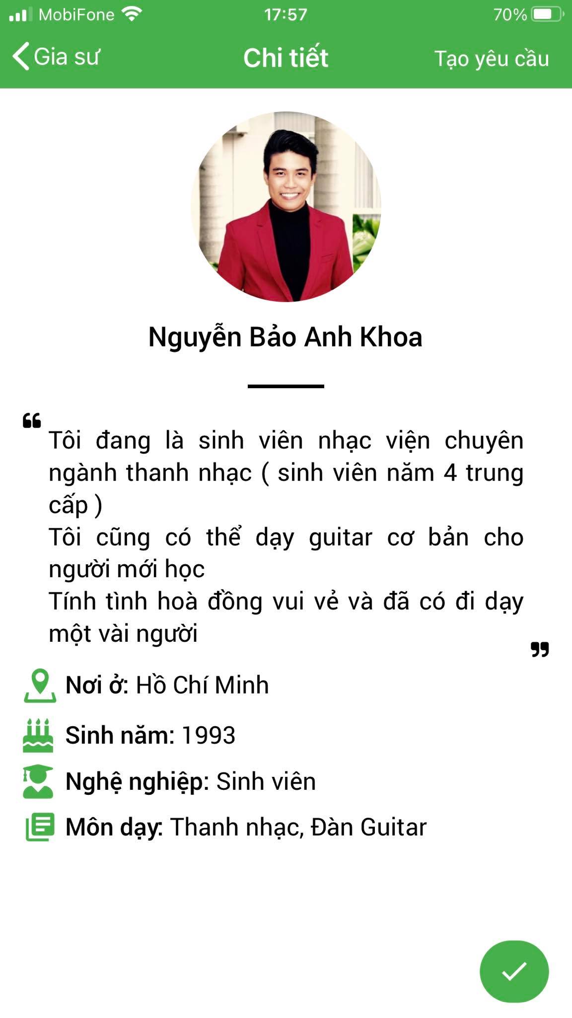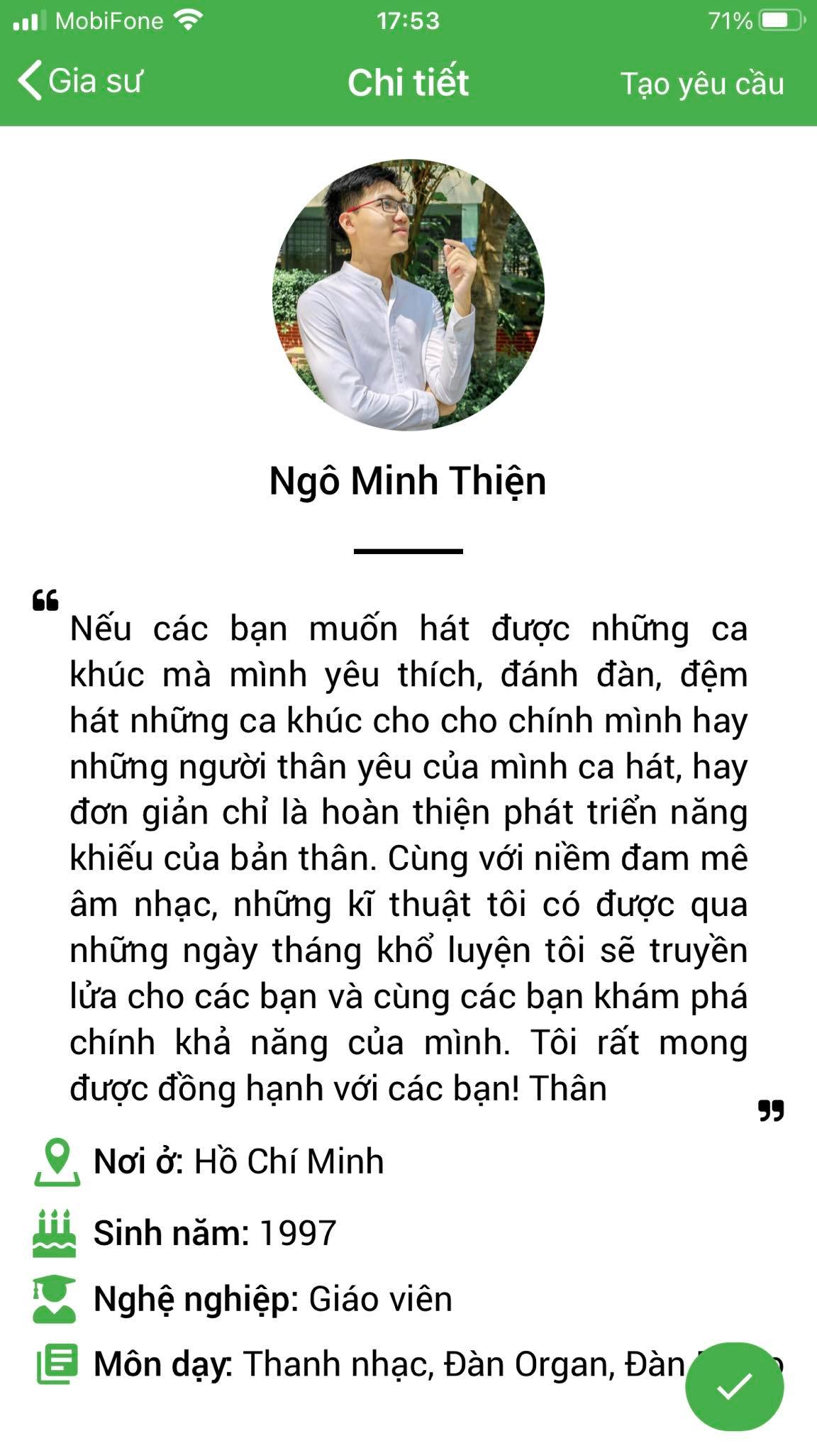 Mình là Nhàn gvien dạy guitar, mình thường xuyên nhận lớp tại ứng dụng daykemtainha.vn, do mình dạy nhiều nên không có thời gian qua trung tâm, mình chỉ qua 2 lần tại quận 8 phạm thế hiển còn những lần sau đa số mình nhận lớp qua chuyển khoản, nhận lớp tiện lợi, lớp có trục trặc từ phụ huynh mình đều được chị My chuyển khoản lại. mình nhận lớp ở đây rất an tâm.