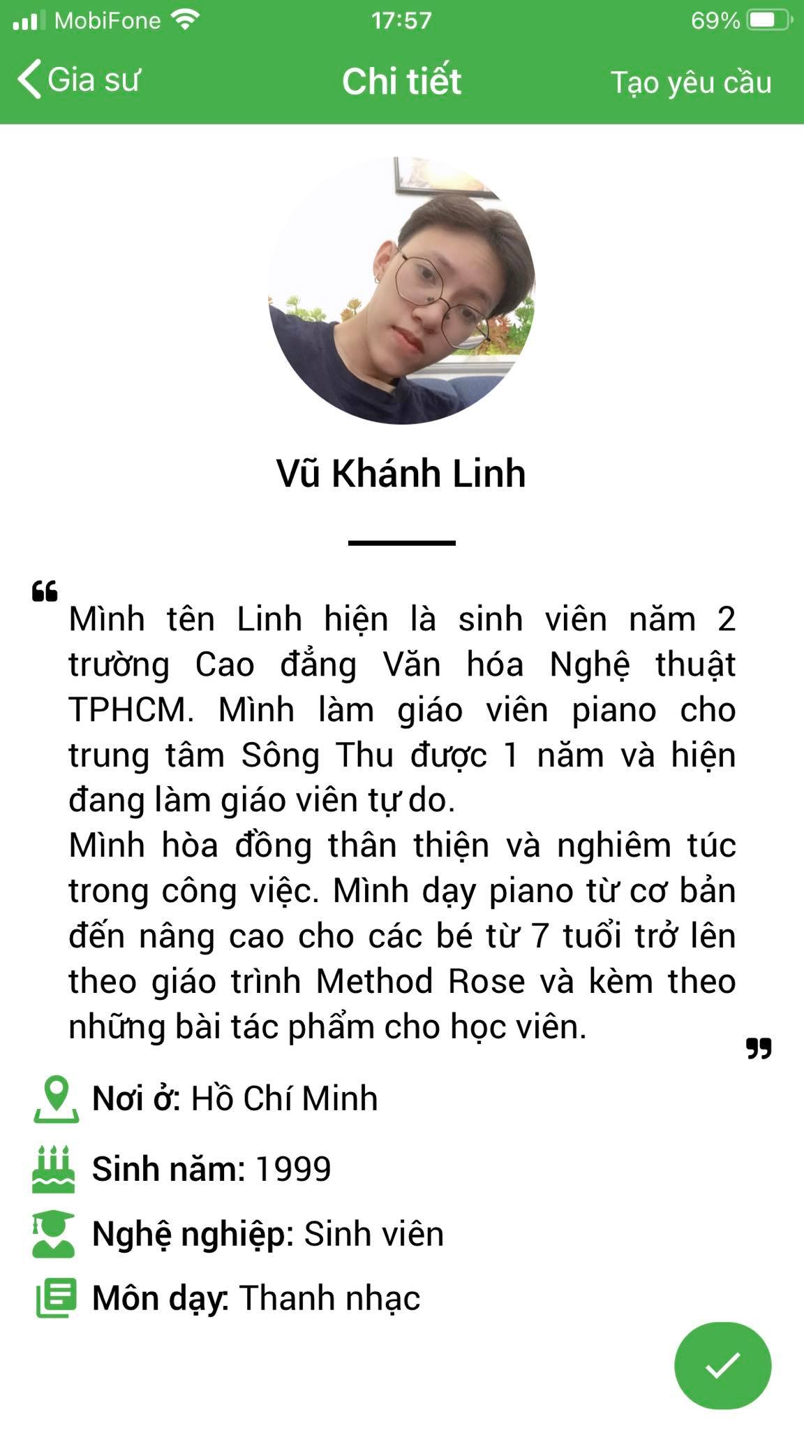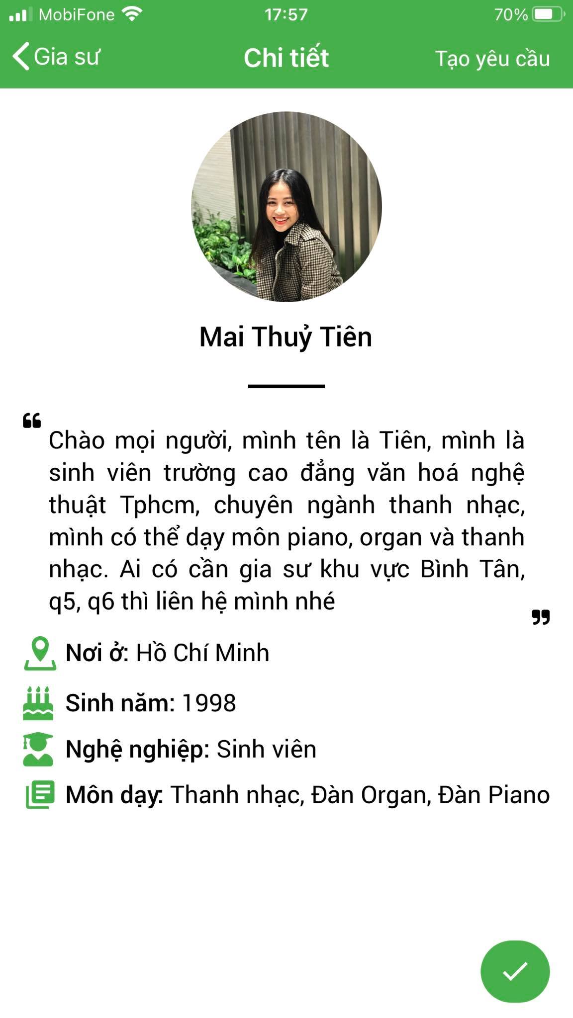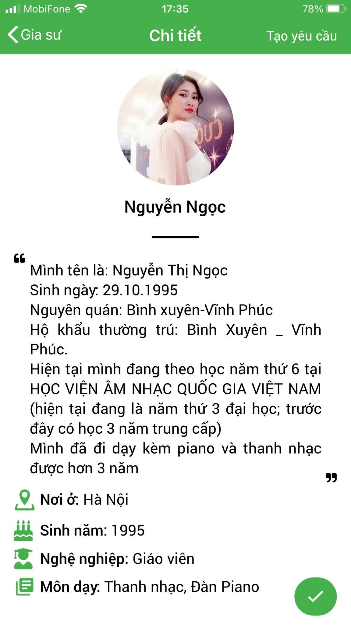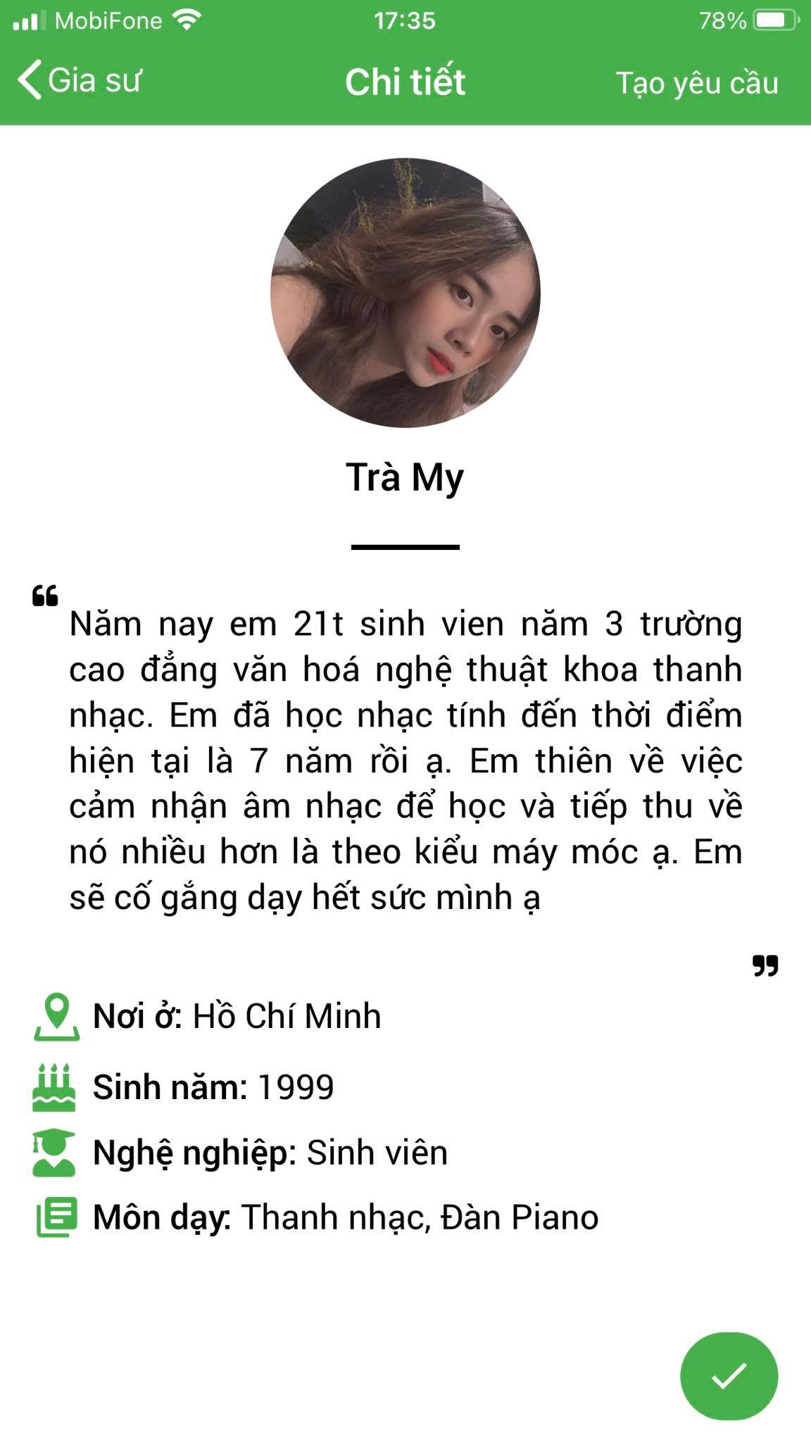 Mình là Thảo My giáo viên chuyên môn Piano, mình nhận lớp tại Daykemtainha.vn rất nhiều, hiện tại mình đang full lớp, không có thời gian nghỉ ngơi luôn, à mình chia sẻ về cách làm việc của trung tâm nhé, mình hợp tác tại đây rất okie, lớp được bảo lãnh trong 1 tháng, nên các lớp lỗi từ học viên phụ huynh My đều nhận lại được phí. rất vui được làm việc với daykemtainha.vn