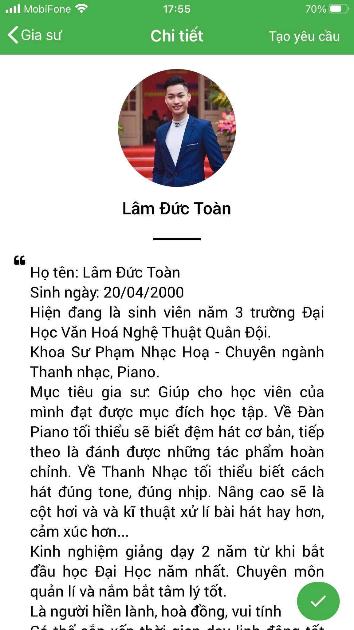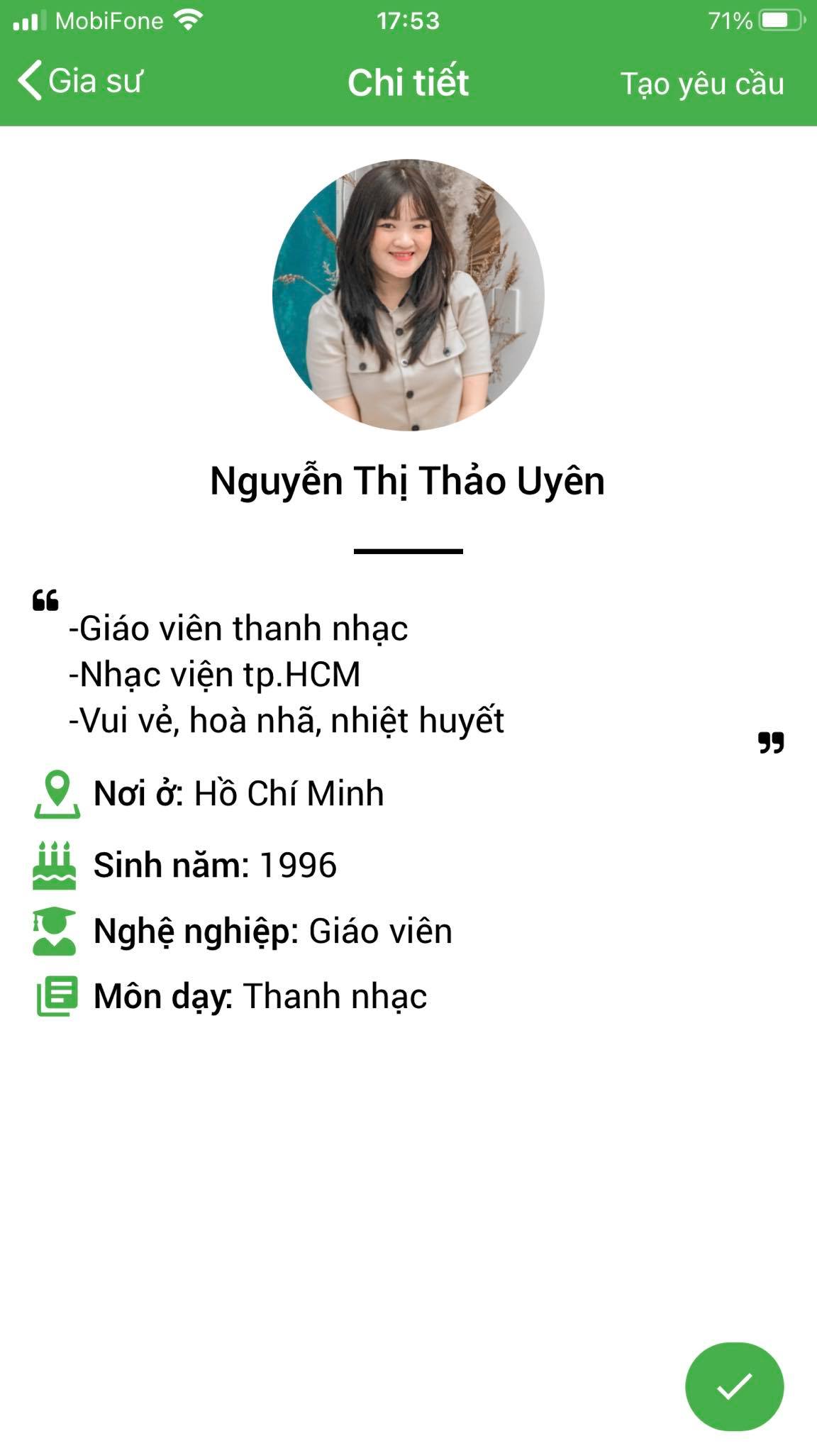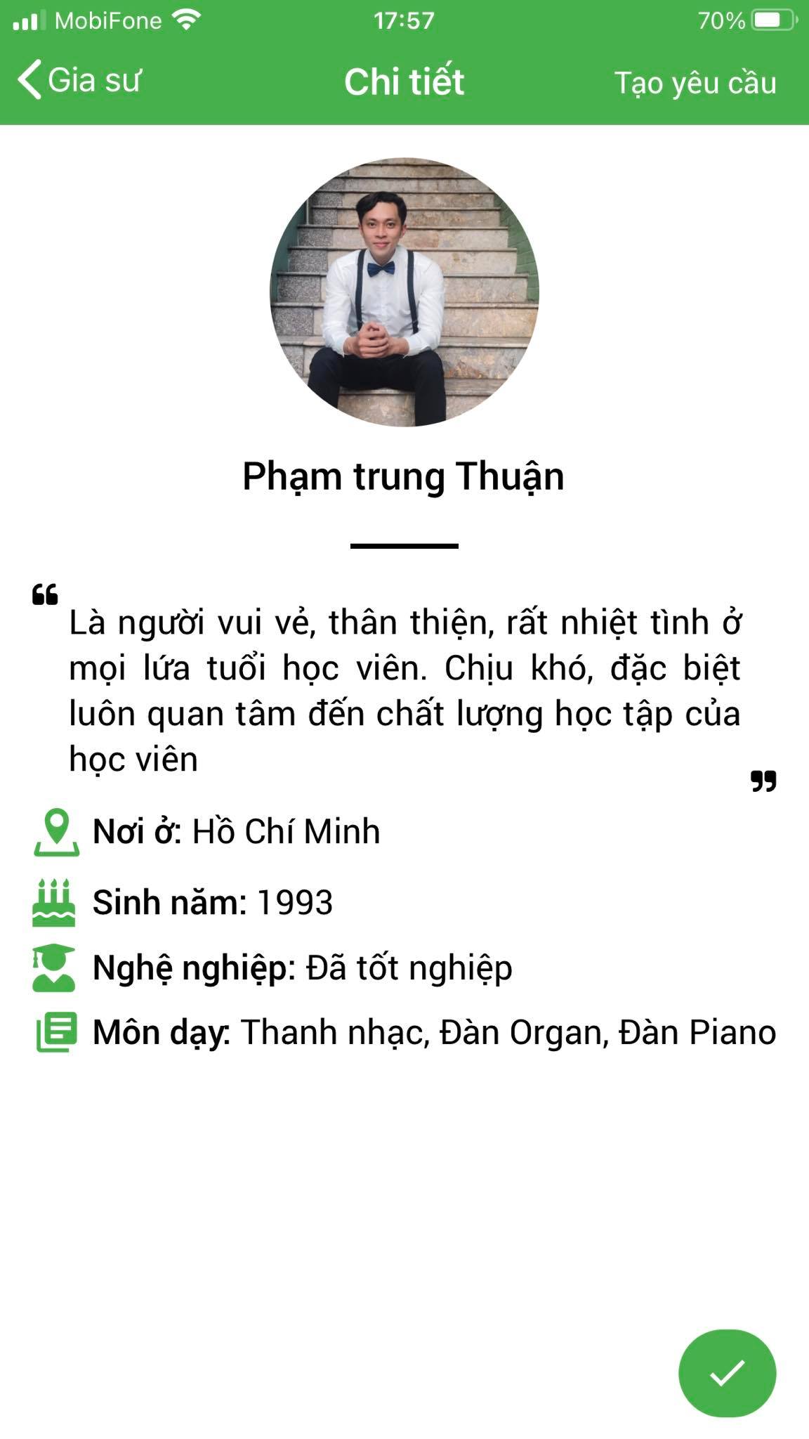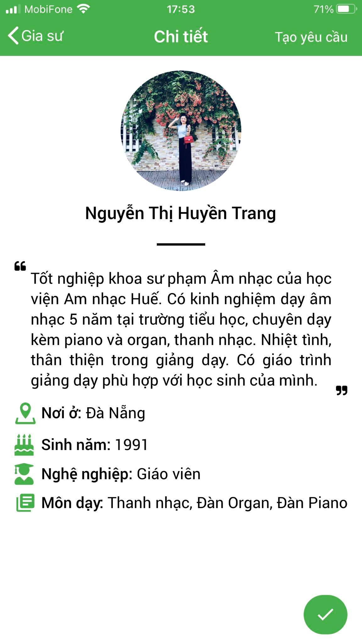 Mình là Thảo My giáo viên chuyên môn Piano, mình nhận lớp tại Daykemtainha.vn rất nhiều, hiện tại mình đang full lớp, không có thời gian nghỉ ngơi luôn, à mình chia sẻ về cách làm việc của trung tâm nhé, mình hợp tác tại đây rất okie, lớp được bảo lãnh trong 1 tháng, nên các lớp lỗi từ học viên phụ huynh My đều nhận lại được phí. rất vui được làm việc với daykemtainha.vn