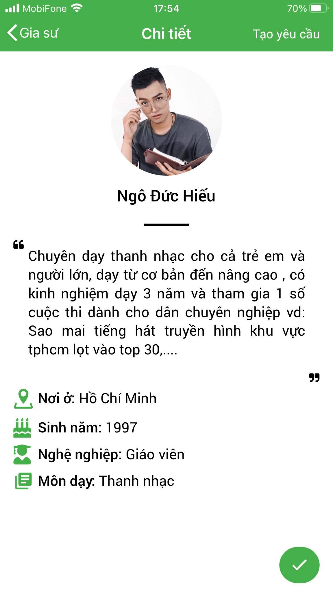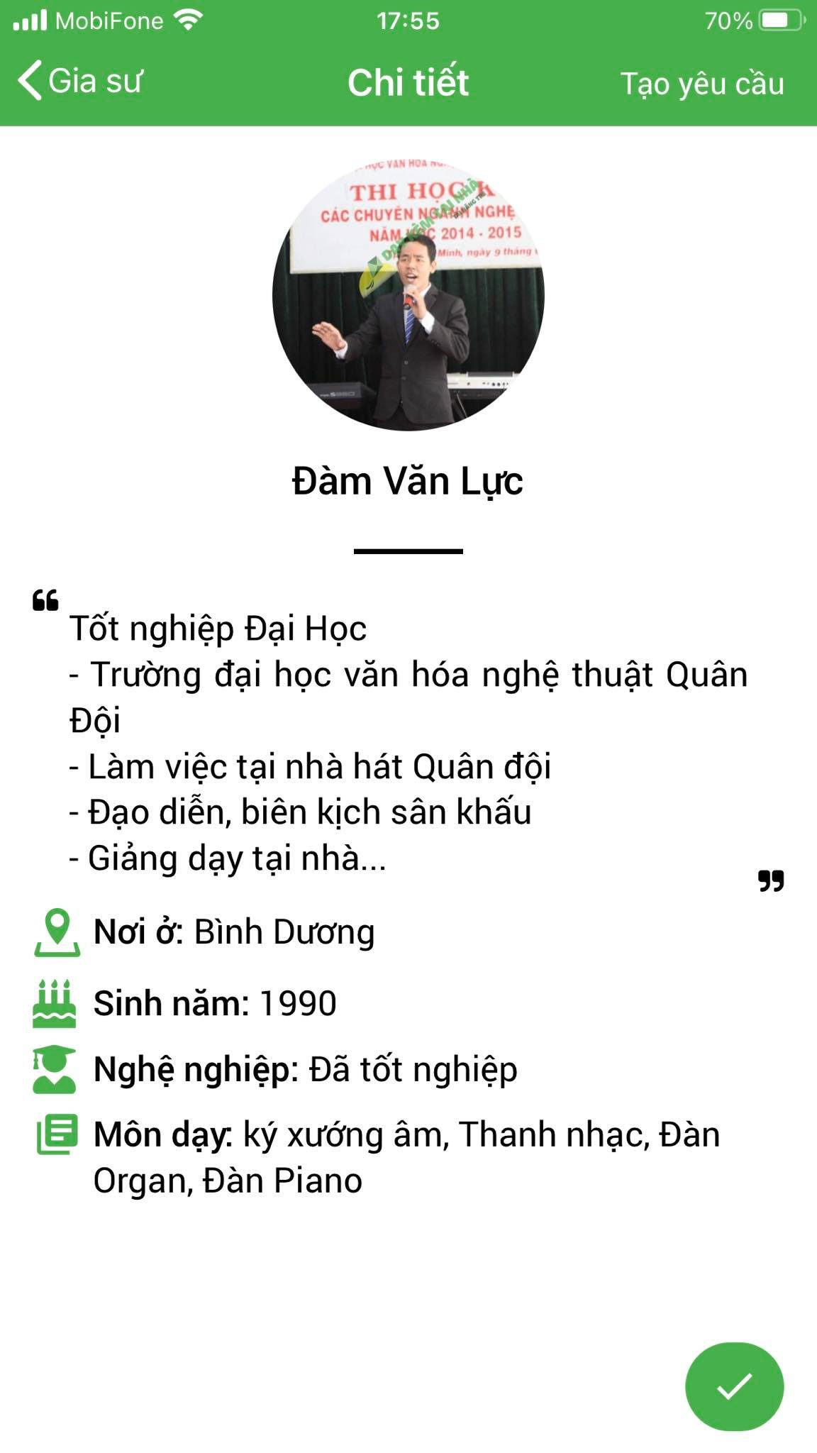 Phụ huynh học viên điền yêu cầu tìm gia sư THANH NHẠC tại form dưới đây, học phí học THANH NHẠC sẽ được hiển thị tự động theo yêu cầu của bạn.